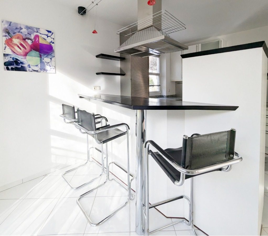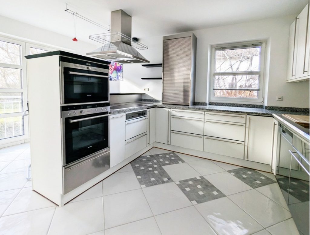 Die Küche mit Granitarbeitsplatte, hochwertigen Elektrogeräten (u.a. Herd mit Pyrolyse) und integrierter Sitzbar verbindet Funktionalität mit klarer Gestaltung. Von der Garage aus besteht ein direkter Zugang ins Haus – ein durchdachtes Detail im Alltag.