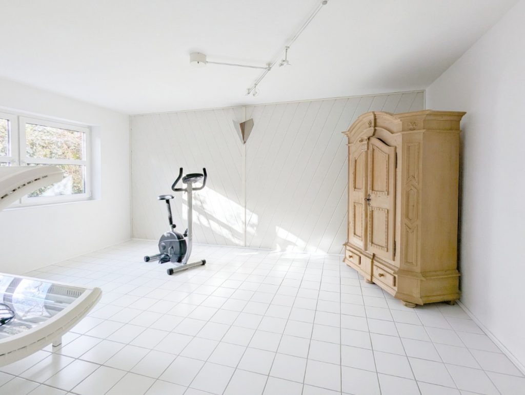 Im Untergeschoss erwartet Sie ein großzügiger Wellnessbereich mit Indoor-Pool und Tageslichteinfall durch Abböschungen, Sauna (auch als Dampfsauna nutzbar) sowie separatem Duschbad. Ein Ort, um Abstand vom Alltag zu gewinnen und zur Ruhe zu kommen. Ergänzt wird das Raumangebot durch Fitness-, Hauswirtschafts- und Vorratsraum.