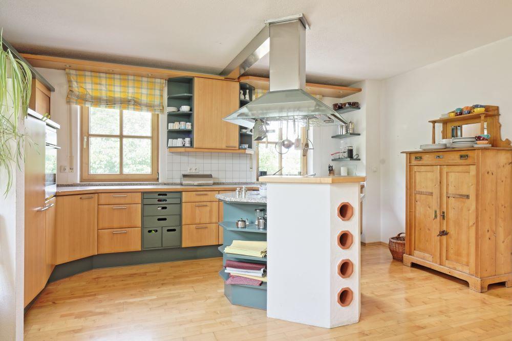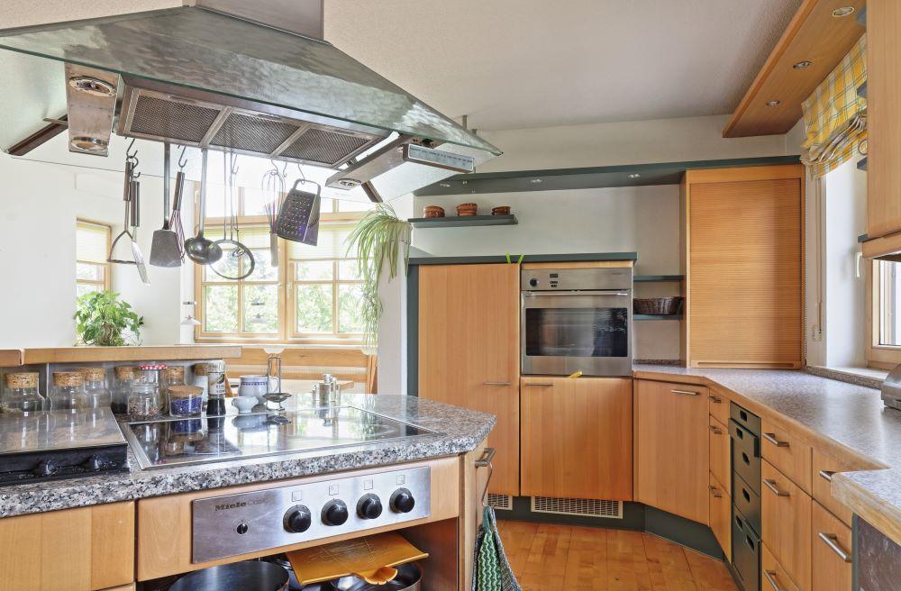 große Küche mit heller Essecke