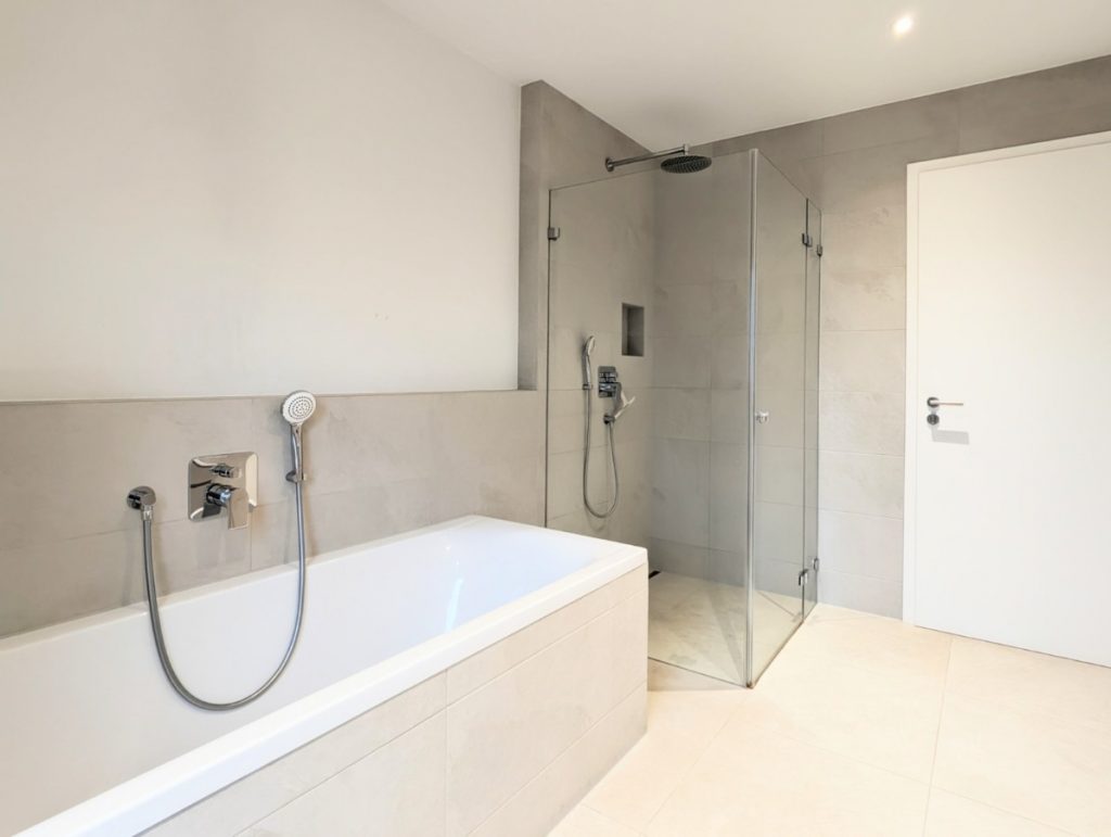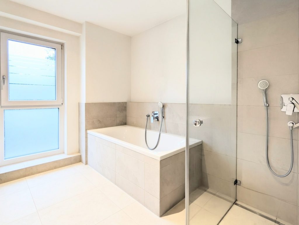 • Tageslichtbad mit ebenerdiger Dusche, Echtglasabtrennung und zusätzlicher Badewanne – keramische Ausstattung und Amaturen von Richter und Frenzel