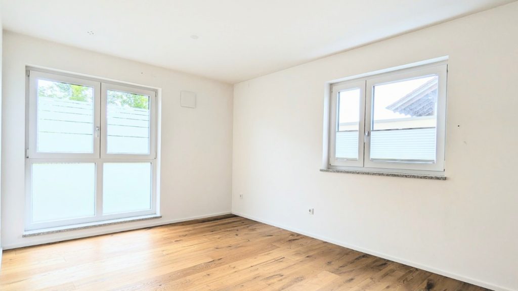 • Großflächige, bodentiefe Fenster mit 3-fach-Isolierverglasung, Kunststoff-Rollläden mit elektrischer Steuerung – Rollladenkästen nach ENV